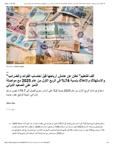 5/2/25, 3:38 PM "ﻲﻟودﻟا دﯾﻌﺻﻟا ﻰﻠﻋ وﻣﻧﻟا ﺔﻠﺻاوﻣ ﻊﻣ 2025 مﺎﻋ نﻣ لوﻷا ﻊﺑرﻟا ﻲﻓ %74 ﺔﺑﺳﻧﺑ كﻼھﻹاو كﻼﮭﺗﺳﻻاو بﺋارﺿﻟاو دﺋاوﻔﻟا بﺎﺳﺗﺣا لﺑﻗ ﺎﮭﺣﺎﺑرأ شﻣﺎھ نﻋ نﻠﻌﺗ "مﯾﻠﻌﺗﻠﻟ فﻟأ