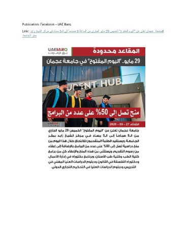 Publication: Facebook – UAE Barq ـ Link: دياز خيشلا زكرم يف ًءاسم 5 لا ىلإ ًاحابص 9 ةعاسلا نم يراجلا ويام 29 سيمخلا "حوتفملا مويلا" نع نلعت نامجع_ةعماج# .ةعماجلا رقمب