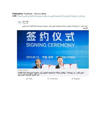 Publication: Facebook – Hormuz News Link: " طسولأا قرشلا يف ةدايقلا ةيتاذ ةيتسجول ةموظنم لوأ ريوطتل ةيجيتارتسا ةكارش ناعقوت "كتسوليز"و "سكإ نفس