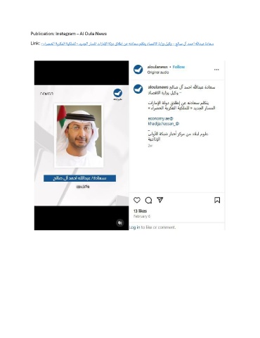 Publication: Instagram – Al Oula News Link: » ءارضخلا ةيركفلا ةيكلملل « ديدجلا راسلما تاراملإا ةلود قلاطإ نع هتداعس ملكتي داصقلاا ةرازو ليكو حلاص لآ دمحا اللهدبع ةداعس –