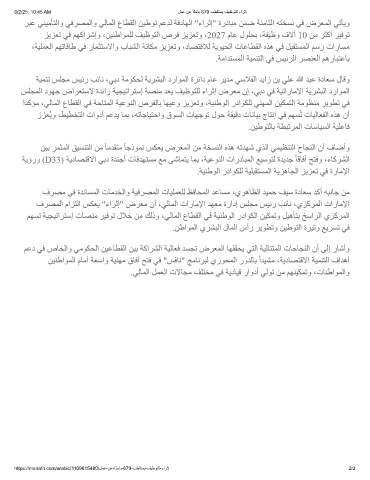 ﺮﺒﻋ ﻲﻨﯿﻣﺄﺘﻟاو ﻲﻓﺮﺼﻤﻟاو ﻲﻟﺎﻤﻟا عﺎﻄﻘﻟا ﻦﯿطﻮﺗ ﻢﻋﺪﻟ ﺔﻓدﺎﮭﻟا "ءاﺮﺛإ" ةردﺎﺒﻣ ﻦﻤﺿ ﺔﻨﻣﺎﺜﻟا ﮫﺘﺨﺴﻧ ﻲﻓ ضﺮﻌﻤﻟا ﻲﺗﺄﯾو