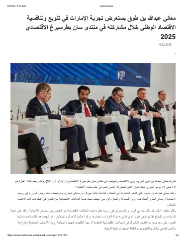 نﻣ ةرﺗﻔﻟا لﻼﺧ دﻘﻌﯾ يذﻟاو ،(SPIEF 2025) يدﺎﺻﺗﻗﻻا غرﺑﺳرطﺑ نﺎﺳ ىدﺗﻧﻣ ﻲﻓ ،ﺔﺣﺎﯾﺳﻟاو دﺎﺻﺗﻗﻻا رﯾزو ،يرﻣﻟا قوط نﺑ ﷲدﺑﻋ ﻲﻟﺎﻌﻣ كرﺎﺷ