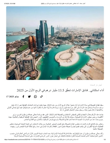 رﺎﯿﻠﻣ 13.5 ﻮﺤﻧ ﺔﯿﻗﺪﻨﻔﻟا تﺂﺸﻨﻤﻟا تاداﺮﯾإ ﺖﻐﻠﺑ ﺚﯿﺣ ،2025 مﺎﻋ ﻦﻣ لوﻷا ﻊﺑﺮﻟا لﻼﺧ ا ً ﺰﯿﻤﺘﻣ ًءادأ تارﺎﻣﻹا ﺔﻟود ﻲﻓ ﺔﻓﺎﯿﻀﻟا عﺎﻄﻗ ﻞّﺠﺳ