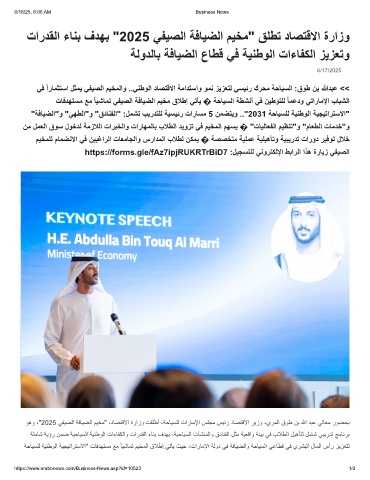وھو ،"2025 ﻲﻔﯾﺻﻟا ﺔﻓﺎﯾﺿﻟا مﯾﺧﻣ" ،دﺎﺻﺗﻗﻻا ةرازو تﻘﻠطأ ،ﺔﺣﺎﯾﺳﻠﻟ تارﺎﻣﻹا سﻠﺟﻣ سﯾﺋر دﺎﺻﺗﻗﻻا رﯾزو ،يرﻣﻟا قوط نﺑ ﷲ دﺑﻋ ﻲﻟﺎﻌﻣ روﺿﺣﺑ