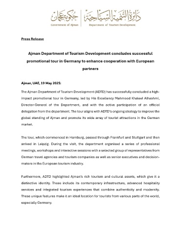 global standing of Ajman and promote its wide array of tourist attractions in the German