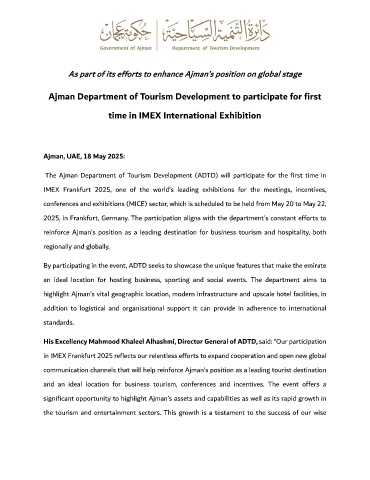 The Ajman Department of Tourism Development (ADTD) will participate for the first time in