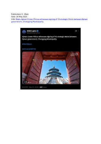 Publication: X - Wam Date: 26 May 2025 Link: Wam: Ajman Crown Prince witnesses signing of 10 strategic MoUs between Ajman government, Chongqing Municipality