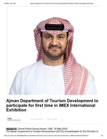 5/20/25, 10:41 AM Ajman Department of Tourism Development to participate for first time in IMEX International Exhibition