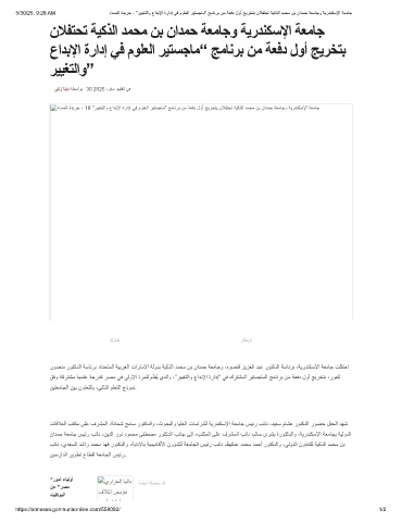 5/30/25, 9:28 AM ءﺎﺳﻣﻟا ةدﯾرﺟ - "رﯾﯾﻐﺗﻟاو عادﺑﻹا ةرادإ ﻲﻓ موﻠﻌﻟا رﯾﺗﺳﺟﺎﻣ" ﺞﻣﺎﻧرﺑ نﻣ ﺔﻌﻓد لوأ ﺞﯾرﺧﺗﺑ نﻼﻔﺗﺣﺗ ﺔﯾﻛذﻟا دﻣﺣﻣ نﺑ نادﻣﺣ ﺔﻌﻣﺎﺟو ﺔﯾردﻧﻛﺳﻹا ﺔﻌﻣﺎﺟ