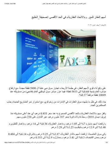 0.484 ﻰﻟإ %6.14 «قاﺮﺷإ»و ﻢھرد 9.25 ﻰﻟإ %1.87 «ﺔﯾرﺎﻘﻌﻟا راﺪﻟا» ﻢﮭﺳأ ﺖﻌﻔﺗرا ،ﺔﻤﺻﺎﻌﻟا قﻮﺳ ﻲﻓو