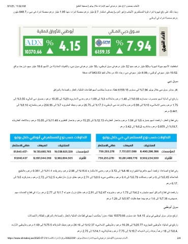 ﺞﯾﻠﺧﻟا»و مھرد 0.351 ﻰﻟإ %11.4 «كﯾرد»و ،مھرد 2.96 ﻰﻟإ %15.6 «رﺎﻣﺛﺗﺳﻼﻟ ﻲﺑد»و ،مھرد 3.72 ﻰﻟإ %8.46 «نارﯾطﻠﻟ ﺔﯾﺑرﻌﻟا» مﮭﺳأ تﻌﻔﺗرا ،ﺔﻋﺎﻧﺻﻟا عﺎطﻗ ﻲﻓو