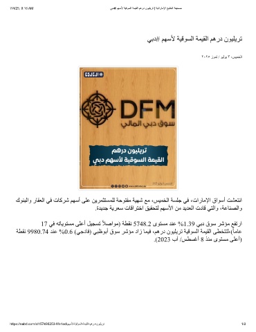 ﺔﻄﻘﻧ 9980.74 ﺪﻨﻋ %0.6 (ﻲﺟدﺎﻓ) ﻲﺒظﻮﺑأ قﻮﺳ ﺮﺷﺆﻣ داز ﺎﻤﯿﻓ ،ﻢھرد نﻮﯿﻠﯾﺮﺗ ﺔﯿﻗﻮﺴﻟا ﺔﻤﯿﻘﻟا ﻰﻄﺨﺘﺘﻟ،(ﺎﻣﺎﻋ