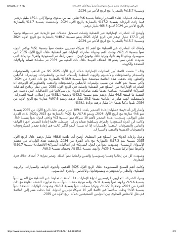 ﺔﻧرﺎﻘﻤﻟﺎﺑ %1.7 ﺔﺒﺴﻨﺑ ﺖﻀﻔﺨﻧاو ،2024 لوﻷا ﻊﺑﺮﻟﺎﺑ ﺔﻧرﺎﻘﻤﻟﺎﺑ %17.2 ﺔﺒﺴﻨﺑ تادراﻮﻟا تداز ﺎﻤﯿﻓ