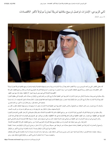 ً ﺎﻗﻮﺛﻮﻣ ً ﺎﯾرﺎﺠﺗ ً ﺎﻜﯾﺮﺷ ﺎﮭﺘﻧﺎﻜﻣ ﺦﯿﺳﺮﺗ ﻞﺻاﻮﺗ ةﺪﯿﺷﺮﻟا ﺎﮭﺗدﺎﯿﻗ تﺎﮭﯿﺟﻮﺗو ﻢﻋدو ﺔﯾؤﺮﺑ تارﺎﻣﻹا ﺔﻟود نأ ﺔﯿﺟرﺎﺨﻟا ةرﺎﺠﺘﻠﻟ ﺔﻟود ﺮﯾزو يدﻮﯾﺰﻟا ﺪﻤﺣأ ﻦﺑ ﻲﻧﺎﺛ رﻮﺘﻛﺪﻟا ﻲﻟﺎﻌﻣ ﺪﻛأ