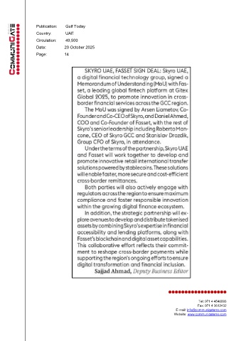 Publication: Gulf Today Country: UAE Circulation: 49,500 Date: 20 October 2025 Page: 14 Tel: 971 4 4546093 Fax: 971 4 3612432 E-mail: info@communigateme.com Website: www.communigateme.com