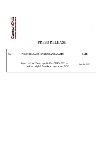 . PRESS RELEASE No. PRESS RELEASES (ENGLISH AND ARABIC) DATE 1 Skyro UAE and Fasset sign MoU at GITEX 2025 to October 2025 enhance digital financial services across GCC