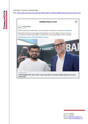 Publication: Facebook -Aletihad News Title: Skyro UAE and Fasset sign MoU at GITEX 2025 to enhance digital financial services across GCC Tel: 971 4 4546093 Fax: 971 4 3612432 E-mail: info@communigateme.com Website: www.communigateme.com
