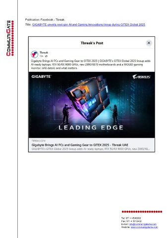 Publication: Facebook - Tbreak Title: GIGABYTE unveils next-gen AI and Gaming Innovations lineup during GITEX Global 2025 Tel: 971 4 4546093 Fax: 971 4 3612432 E-mail: info@communigateme.com Website: www.communigateme.com