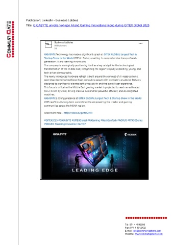 Publication: LinkedIn - Business Lobbies Title: GIGABYTE unveils next-gen AI and Gaming Innovations lineup during GITEX Global 2025 Tel: 971 4 4546093 Fax: 971 4 3612432 E-mail: info@communigateme.com Website: www.communigateme.com