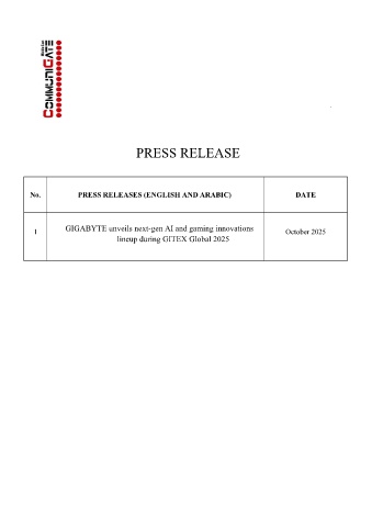 . PRESS RELEASE No. PRESS RELEASES (ENGLISH AND ARABIC) DATE 1 GIGABYTE unveils next-gen AI and gaming innovations October 2025 lineup during GITEX Global 2025
