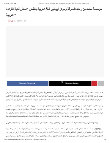 4/21/25, 10:56 AM مﻼﺳﻟا ﺔﻟﺎﺳر – “ ﺔﯾﺑرﻌﻟا ةءارﻘﻟا ﺔﯾدﻧأ ﻰﻘﺗﻠﻣ“ نﺎﻣظﻧﯾ ﺔﯾﺑرﻌﻟا ﺔﻐﻠﻟ ﻲﺑظوﺑأ زﻛرﻣو ﺔﻓرﻌﻣﻠﻟ دﺷار نﺑ دﻣﺣﻣ ﺔﺳﺳؤﻣ