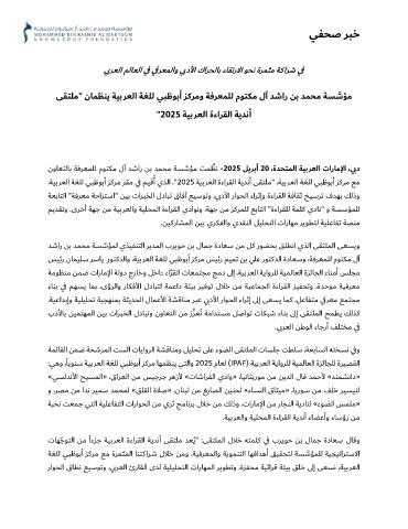 ،ﺔﻴﺑﺮﻌﻟا ﺔﻐﻠﻟ ﻲﺒﻇﻮﺑأ ﺰﻛﺮﻣ ﺮﻘﻣ ي ﻓ ﻢﻴﻗأ يﺬﻟا ،" 2025 ﺔﻴﺑﺮﻌﻟا ةءاﺮﻘﻟا ﺔﻳﺪﻧأ ﻰﻘﺘﻠﻣ" ،ﺔﻴﺑﺮﻌﻟا ﺔﻐﻠﻟ ﻲﺒﻇﻮﺑأ ﺰﻛﺮﻣ ﻊﻣ