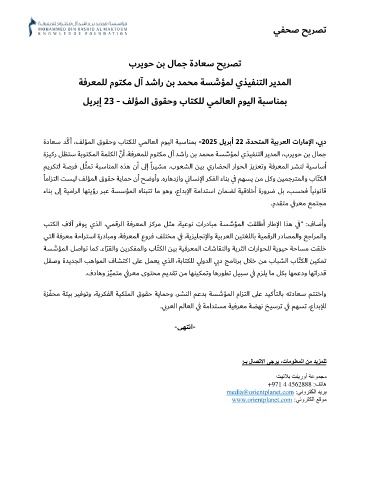 ةدﺎﻌﺳ ﺪ �ﻛأ ،ﻒﻟﺆﻤﻟا قﻮﻘﺣو بﺎﺘﻜﻠﻟ ﻲﻤﻟﺎﻌﻟا مﻮﻴﻟا ﺔﺒﺳﺎﻨﻤﺑ - 2025 ﻞﻳﺮﺑأ 22 ،ةﺪﺤﺘﻤﻟا ﺔﻴﺑﺮﻌﻟا تارﺎﻣﻹا ،ي ﺑد