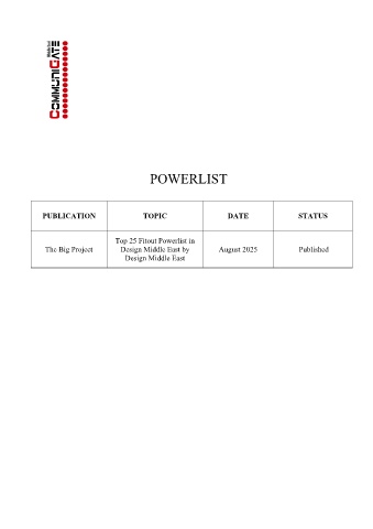 POWERLIST PUBLICATION TOPIC DATE STATUS Top 25 Fitout Powerlist in The Big Project Design Middle East by August 2025 Published Design Middle East