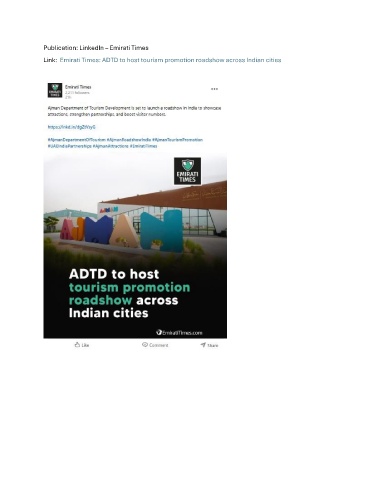 Publication: LinkedIn – Emirati Times Link: Emirati Times: ADTD to host tourism promotion roadshow across Indian cities