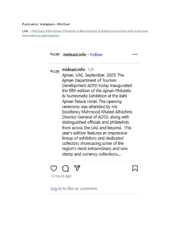 Publication: Instagram – Mid East Link: - Mid-East: Fifth Ajman Philatelic & Numismatic Exhibition launches with extensive international participation
