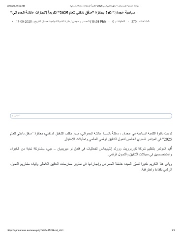 9/18/25, 9:42 AM "ﻲﻧارﻣﺣﻟا ﺔﺷﺋﺎﻋ تازﺎﺟﻧﻹ ً ﺎﻣﯾرﻛﺗ "2025 مﺎﻌﻠﻟ ﻲﻠﺧاد ﻖﻗدﻣ" ةزﺋﺎﺟﺑ زوﻔﺗ "نﺎﻣﺟﻋ ﺔﯾﺣﺎﯾﺳ
