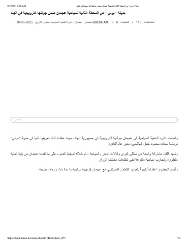 ، 18-09-2025 : ﺦﯾرﺎﺘﻟا نﺎﻤﺠﻋ ﺔﯿﺣﺎﯿﺴﻟا ﺔﯿﻤﻨﺘﻟا ةﺮﺋاد / نﺎﻤﺠﻋ : رﺪﺼﻤﻟا (08:56 AM) ، 0 : تﺎﻘﯿﻠﻌﺘﻟا ، 118 : تاﺪھﺎﺸﻤﻟا