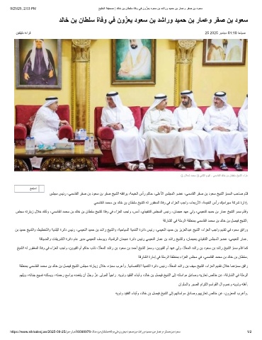 سﻠﺟﻣ ﮫﺗرﺎﯾز لﻼﺧ كﻟذو ،ﻲﻣﺳﺎﻘﻟا دﻣﺣﻣ نﺑ دﻟﺎﺧ نﺑ نﺎطﻠﺳ ﺦﯾﺷﻟا ةﺎﻓو ﻲﻓ ءازﻌﻟا بﺟاو ،سﻣأ ،يذﯾﻔﻧﺗﻟا سﻠﺟﻣﻟا سﯾﺋر ،نﺎﻣﺟﻋ دﮭﻋ ﻲﻟو ،ﻲﻣﯾﻌﻧﻟا دﯾﻣﺣ نﺑ رﺎﻣﻋ ﺦﯾﺷﻟا وﻣﺳ مّدﻗو