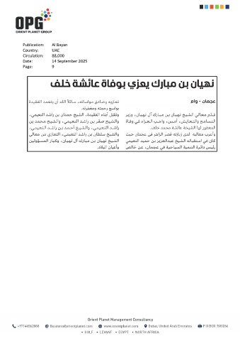 Publication: Al Bayan Country: UAE Circulation: 88,000 Date: 14 September 2025 Page: 9