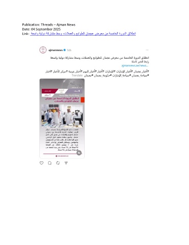 Publication: Threads – Ajman News Date: 04 September 2025 Link: ةعساو ةيلود ةكراشم طسو ،تلامعلاو عباوطلل نامجع ضرعم نم ةسماخلا ةرودلا قلاطنا