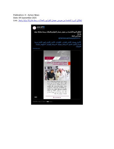 Publication: X – Ajman News Date: 04 September 2025 Link: ةعساو ةيلود ةكراشم طسو ،تلامعلاو عباوطلل نامجع ضرعم نم ةسماخلا ةرودلا قلاطنا
