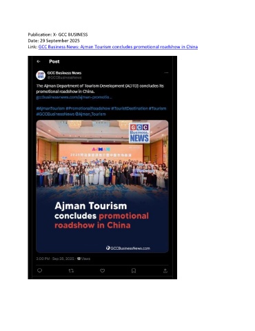 Publication: X- GCC BUSINESS Date: 29 September 2025 Link: GCC Business News: Ajman Tourism concludes promotional roadshow in China