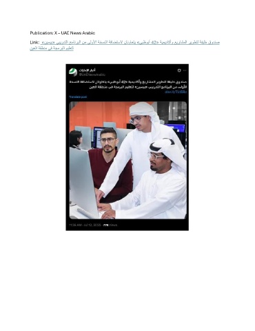 Publication: X – UAE News Arabic Link: »نيسيب« يبيردتلا جمانربلا نم ىلولأا ةخسنلا ةفاضتسلا نانواعتي »يبظوبأ 42« ةيميداكأو عيراشملا ريوطتل ةفيلخ قودنص نيعلا ةقطنم يف ةجمربلا ميلعتل