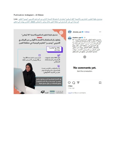 Publication: Instagram – Al Watan Link: ميلعتل "نيسيب" يبيردتلا جمانربلا نم ىلولأا ةخسنلا ةفاضتسلا نانواعتي "يبظوبأ 42" ةيميداكأو عيراشملا ريوطتل ةفيلخ قودنص نيكمت ىلإ فدهي نواعتلا .2025 سطسغأو ويلوي للاخ نيعلا ةقطنم يف قودنصلا رقم يف ،ةجمربلا