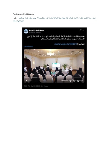 Publication: X – Al Watan Link: عاطقلا يف ةأرملا نيكمت فدهب ،"ةمادتسلال عرزن" ةردابم ةقلاطنا ةطخ قلطي ماعلا يئاسنلا داحتلاا ..ةمطاف ةخيشلا ةياعر تحت مادتسملا يعارزلا