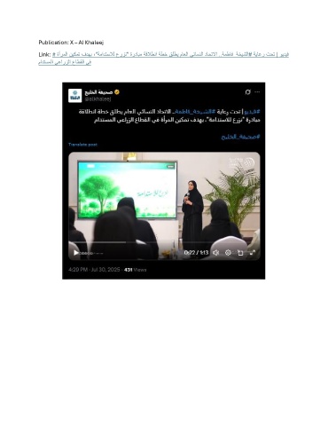 Publication: X – Al Khaleej Link: # ةأرملا نيكمت فدهب ،"ةمادتسلال عرزن" ةردابم ةقلاطنا ةطخ قلطي ماعلا يئاسنلا داحتلاا ..ةمطاف_ةخيشلا# ةياعر تحت | ويديف مادتسملا يعارزلا عاطقلا يف
