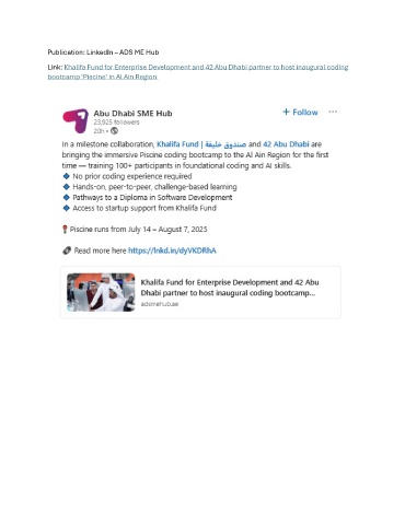 Publication: LinkedIn – ADS ME Hub Link: Khalifa Fund for Enterprise Development and 42 Abu Dhabi partner to host inaugural coding bootcamp ‘Piscine’ in Al Ain Region