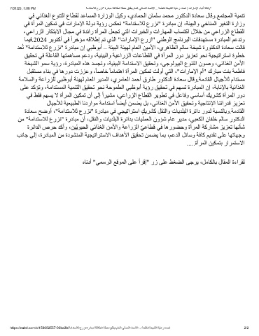 ةﺮﺋاﺪﻟا صﺮﺣ ﺪﻛأو ،ﻦﯿّﯾﻮﯿﺤﻟا ﻲﺋاﺬﻐﻟا ﻦﻣﻷاو ﺔﻋارﺰﻟا ﻲﻋﺎﻄﻗ ﻲﻓ ﺎھرﻮﻀﺣو ةأﺮﻤﻟا ﺔﻛرﺎﺸﻣ ﺰﯾﺰﻌﺗ ﺎﮭﻧﺄﺷ