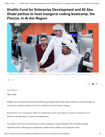 7/10/25, 2:27 PM Khalifa Fund for Enterprise Development and 42 Abu Dhabi partner to host inaugural coding bootcamp, the Piscine, in Al Ain Regio…