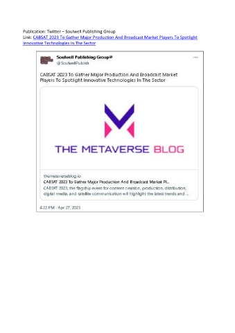Publication: Twitter – Soulwell Publishing Group Link: CABSAT 2023 To Gather Major Production And Broadcast Market Players To Spotlight Innovative Technologies In The Sector
