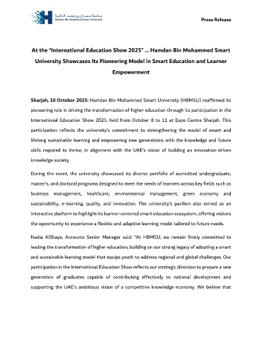 Sharjah, 10 October 2025: Hamdan Bin Mohammed Smart University (HBMSU) reaffirmed its