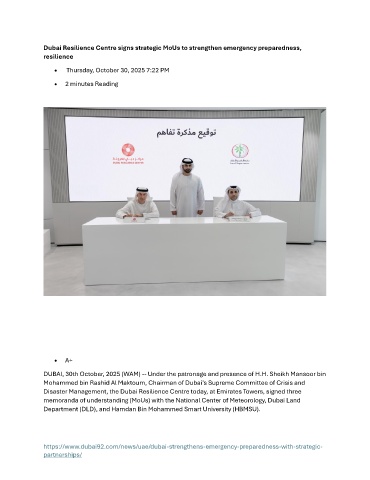 Disaster Management, the Dubai Resilience Centre today, at Emirates Towers, signed three