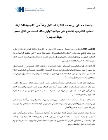 ﺎﻫﺮﻘﻣ ي ﻓ ﺔﻴﻃﺮﺸﻟا مﻮﻠﻌﻠﻟ ﺔﻗرﺎﺸﻟا ﺔﻴﻤﻳدﺎﻛأ ﻦﻣ ًاﺪﻓو ﺔﻴﻛﺬﻟا ﺪﻤﺤﻣ ﻦﺑ ناﺪﻤﺣ ﺔﻌﻣﺎﺟ ﺖﻠﺒﻘﺘﺳا : 2025 ﺮﺑﻮﺘﻛ أ 22