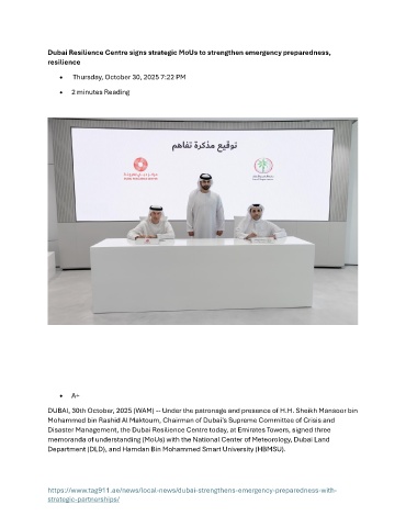 Disaster Management, the Dubai Resilience Centre today, at Emirates Towers, signed three