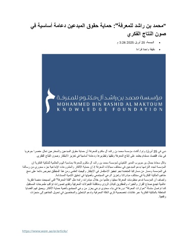 انتلاسر نم يروحم ءزج ةيعادبلإا تاعورشملاو راكفلأا ةيامح نإ ذإ ةفرعملا تلااجم فلتخم يف نيعدبملا معدب اهمازتلا ددجت ةسسؤملا